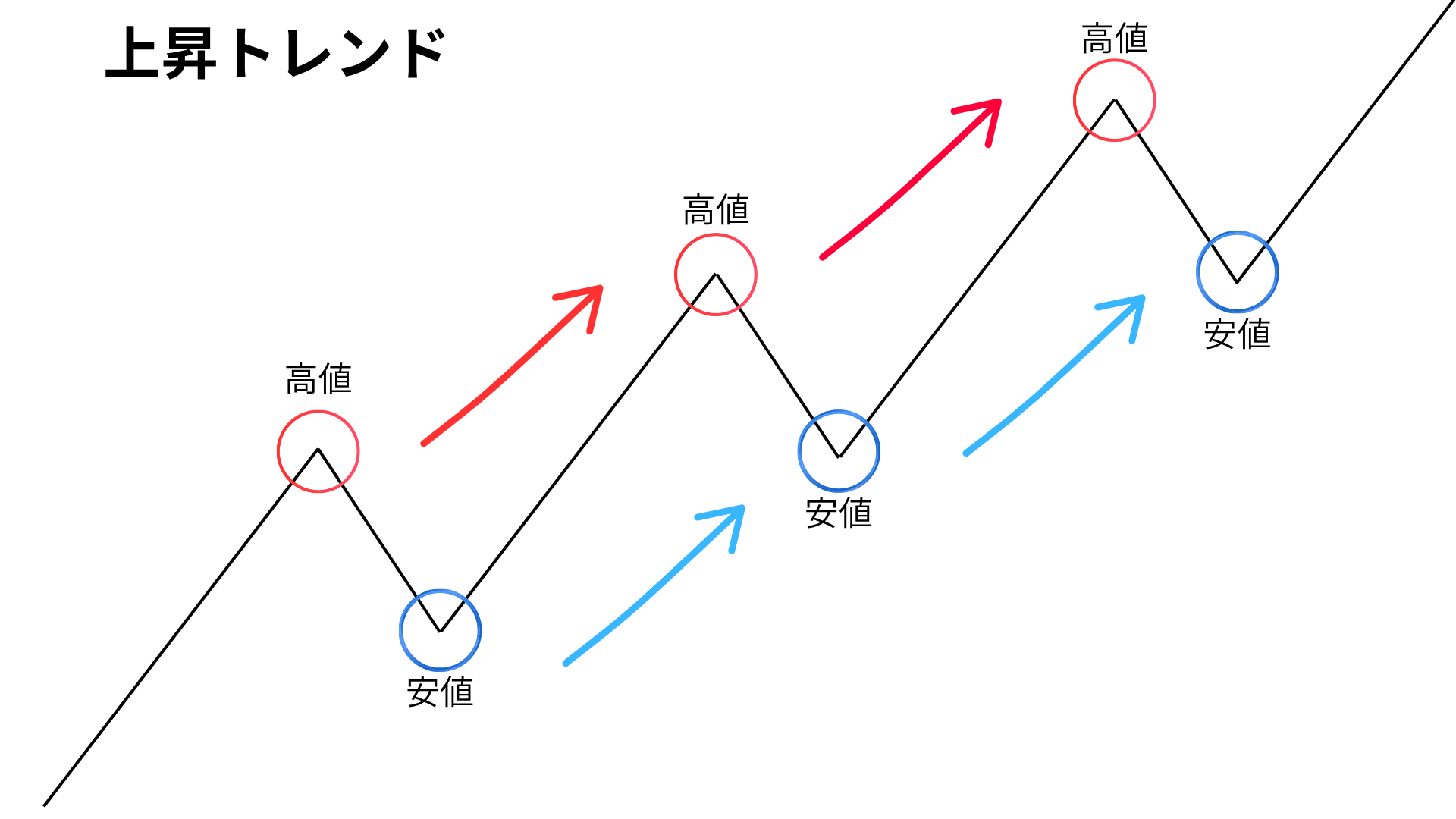 上昇トレンドとは、高値と安値が共に切り上がっている相場