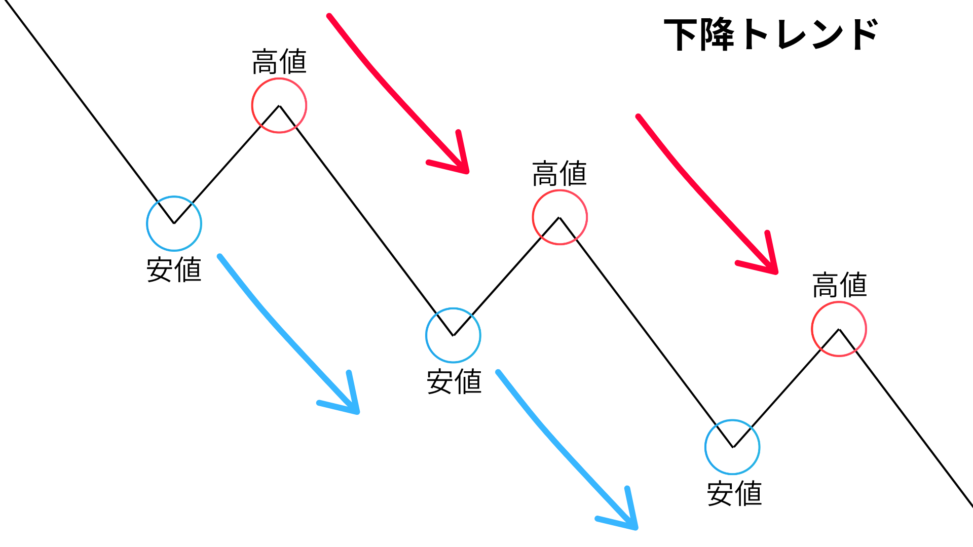 下降トレンドとは、上昇と逆で高値と安値が共に切り下がっている相場